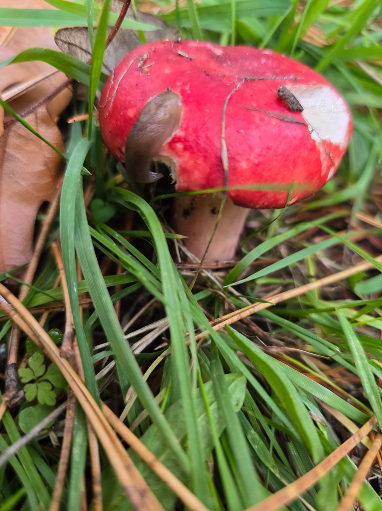 On my walk today, I found a beautiful, vivid red mushroom—the first I’ve ever seen on this path!